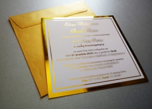 Zaproszenie w formacie 145×145 mm, wydrukowane na papierze powlekanym kredą o gramaturze 350 g, złocone folią w kolorze złotym na gorąco (opcjonalnie dostępna jest folia srebrna)